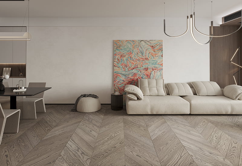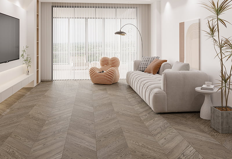 Mejore su espacio con pisos de madera de ingeniería de Chevron de laca de roble blanco, una buena combinación de estilo y durabilidad. La superficie cepillada saca la textura natural del roble blanco, creando un acabado suave y táctil que agrega calidez y sofisticación a cualquier habitación. El patrón clásico de Chevron proporciona un diseño geométrico atemporal que se ajusta a la perfección tanto en interiores modernos como tradicionales. Hecho con una calificación ABC, este piso está diseñado para un rendimiento duradero, lo que lo hace ideal para áreas de alto tráfico en entornos residenciales y comerciales. El recubrimiento de laca UV no solo protege la madera, sino que también mejora su belleza natural, asegurando que el piso permanezca impresionante con el tiempo. Su diseño atemporal y un acabado de alta calidad lo convierten en la opción ideal para crear una atmósfera acogedora y duradera.