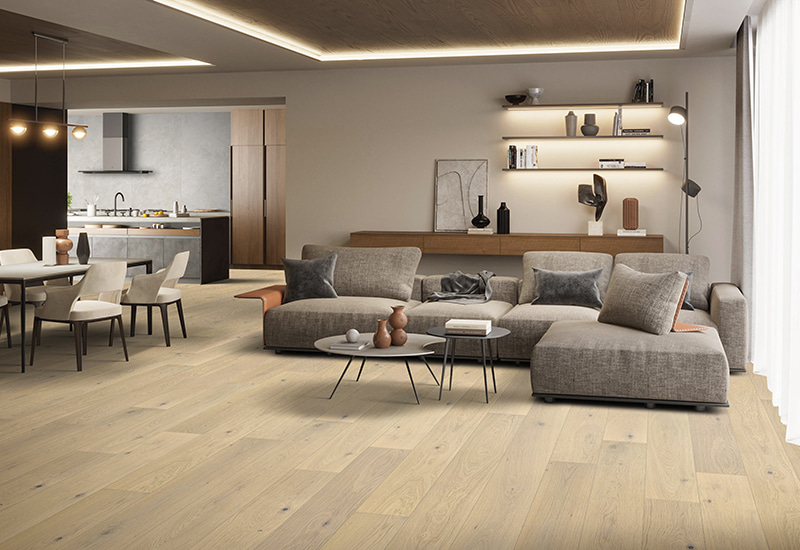 LEER MÁSGimli White Oak Light Engineado Wood Wood en el piso de la capa de superficie está elaborada a partir de roble blanco cuidadosamente seleccionado, reconocido por su belleza natural, durabilidad y patrones de granos distintivos. El proceso de cepillado de luz mejora la textura de la madera, proporcionando una sensación sutil pero elegante táctil y resaltando su carácter orgánico. deformación. Este diseño asegura que el piso permanezca duradero y confiable en varios entornos, incluidas áreas con niveles de humedad fluctuantes. La técnica de cepillado de luz agrega profundidad y carácter a la madera, creando una apariencia moderna pero natural que complementa sin problemas cualquier estilo de diseño interior.